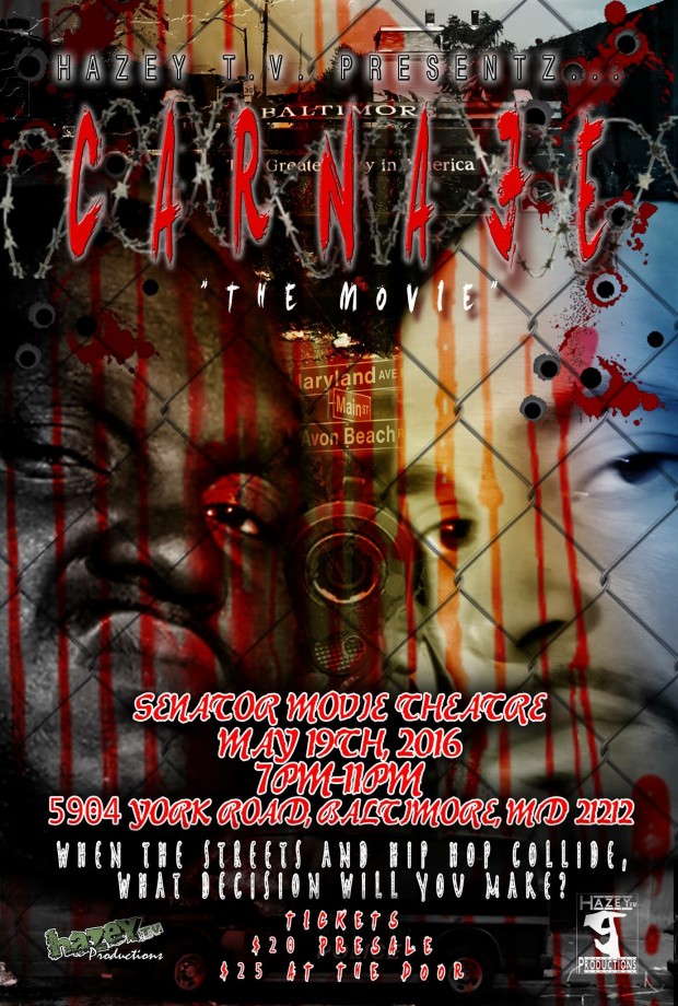 THIS IS AN INDEPENDENT MOVIE PREMIERE BROUGHT TO YOU BY HAZEY T.V. PRODUCTIONS LOVATED IN BALTIMORE, MD! THIS IS HAZEY T.V.'S FIRST EVER MOVIE PREMIERE AND ITS LOCATED AT THE HISTORIC SENATOR MOVIE THEATRE ON UORK TOAD IN BALTIMORE, MD. THIS EVENT IS A GIRST OF ITS KIND WITHIN THE BALTIMORE HIP HOP SCENE AND IS SET TO BE EPIC! CONTACT INFORMATION IS LOCATED ON THE SITE! BELOW IS THE OFFICIAL MOVIE TRAILER FOR THE INDEPENDENT FILM "CARNAJE" WHICH IS BASED OFF OF AN UPCOMING HIP HOP ARTIST THAT IS TAKING THE CITY BY STORM! CHECK IT OUT NOW! #HAZEYTV