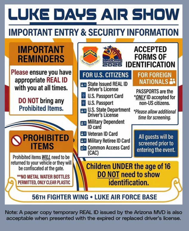 ALL INDIVIDUALS 18 YEARS AND OLDER ENTERING THE FLIGHT LINE AREA THROUGH THE ADMISSION GATES MUST PRODUCE VALID IDENTIFICATION AND ARE SUBJECT TO SEARCH.